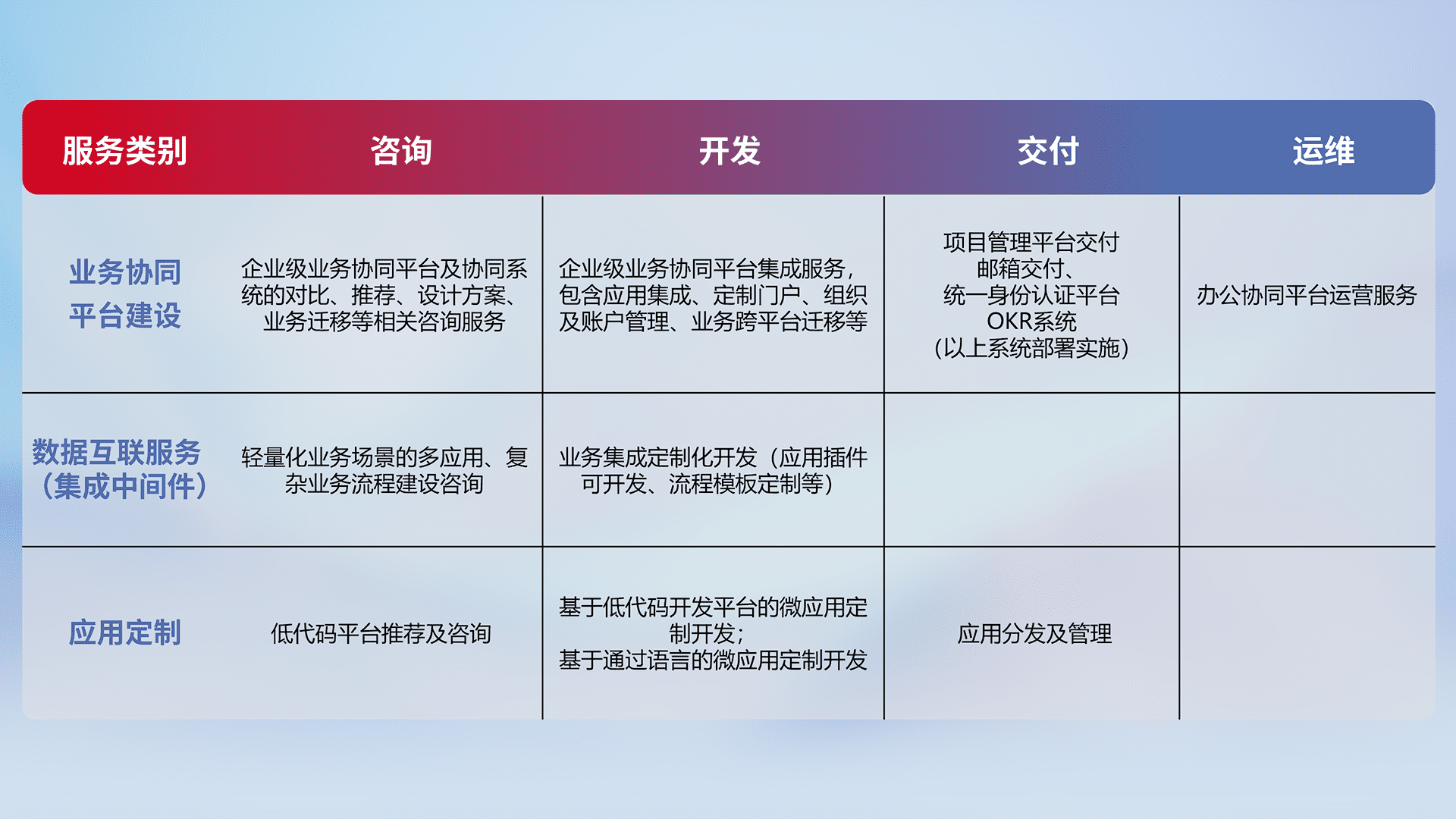针对钉钉、、、企微、、、IDaas等平台级产品提供产品的规划、、方案、、、、交付、、、、定制化开发等服务,,实现如统一协同办公、、、、智能客户服务、、、、混合会议管理、、、、智能数据查询、、、、等业务场景,,,,实现数字化转型。。
